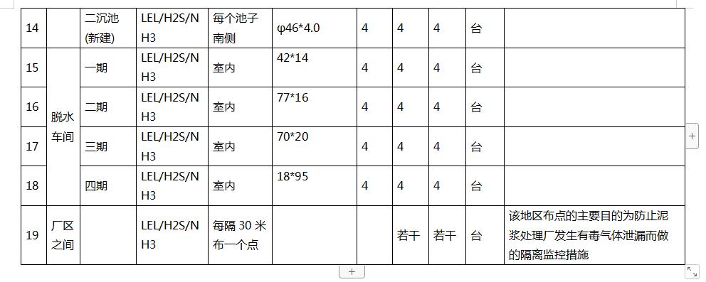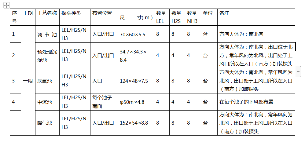 1.1.2 根據(jù)污水處理廠的常用監(jiān)控氣體種類為:可燃氣、H2S和NH3,建議設置VOC檢測器,以檢測有機揮發(fā)物。因此在每個監(jiān)控點上均布置相同的可燃氣、H2S和NH3 探頭。
