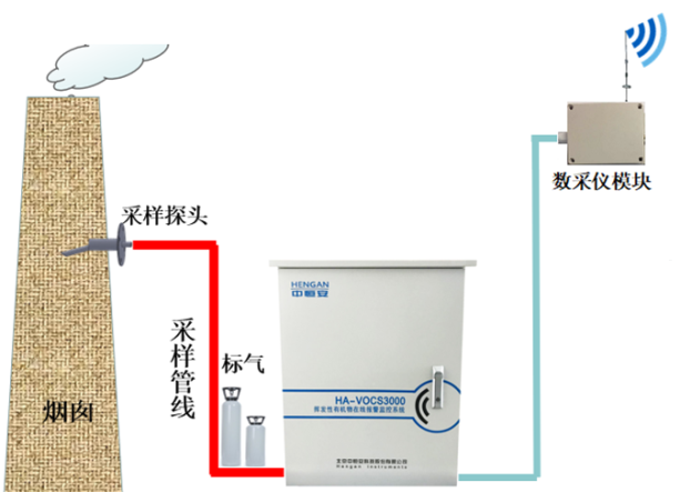 說明:由于現(xiàn)場排放尾氣溫度高(100攝氏度以上),并且濕度太大,傳感器直接測量會(huì)影響使用壽命,故加裝HA-VOCS3000A預(yù)處理系統(tǒng),內(nèi)置抽氣泵將尾氣抽取到監(jiān)測系統(tǒng)進(jìn)行降溫,除濕等操作后輸送到MIC-600氣室進(jìn)行有害因子檢測,并將檢測后的信號通過無線模塊上傳當(dāng)?shù)丨h(huán)保部門進(jìn)行集中監(jiān)控。