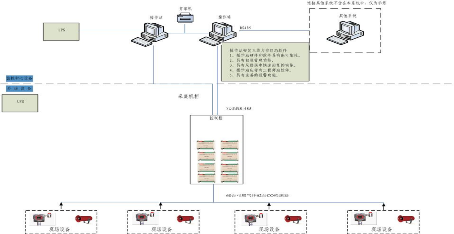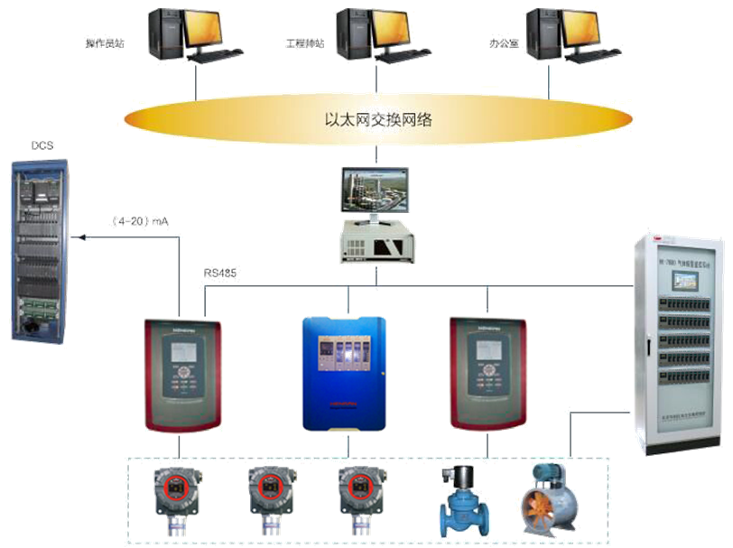 系統(tǒng)由安裝在現(xiàn)場的可燃/有毒氣體探測器和安裝在控制室內(nèi)的控制單元、數(shù)據(jù)采集模塊、工作站等組成。通過數(shù)據(jù)采集模塊對現(xiàn)場檢測器實施數(shù)據(jù)采集,并通過通訊模件完成于操作員站或第三方系統(tǒng)(設(shè)備)之間的通訊,接受相關(guān)信息并傳遞實時數(shù)據(jù)。