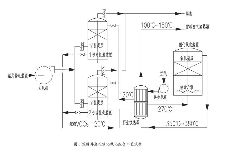 在主風(fēng)機出口引入活性炭裝置和催化氧化裝置(圖3)?;钚蕴垦b置設(shè)置2套,互為備用,當(dāng)一套活性炭裝置吸附飽和后,將廢氣切換到另一套活性炭裝置。飽和的活性炭裝置進(jìn)入活性炭再生,脫附的有機物引入催化氧化裝置分解成水和二氧化碳。經(jīng)催化氧化裝置處理后的廢氣再回至定型廢氣換熱器回收余熱。