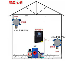 10、對于檢測可燃氣體比重大于空氣的諸如烷烴類(甲烷沼氣、民用煤氣除外)、烯烴類(乙烯除外),液化石油氣、汽油、煤油時,請將探測器安裝在低于泄漏點的下方平面上,距地面不得高于30cm。并請注意周圍的環(huán)境特點,例如室內(nèi)通風不流暢部位,地槽地溝容易積聚可燃氣體的地方,現(xiàn)場通往控制室的地下電纜溝,有密封蓋板的污水溝槽等,都是經(jīng)常性的或在生產(chǎn)不正常情況下容易積聚可燃氣的場所,對于這些環(huán)境都是不可忽視的安全監(jiān)測點。