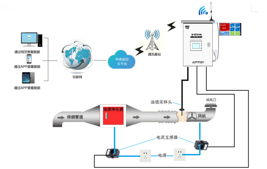 油煙在線監(jiān)測系統(tǒng)是為了滿足餐飲行業(yè)油煙排放監(jiān)管的需求,利用物聯(lián)網(wǎng)技術、GPRS無線通訊及GIS等技術,實現(xiàn)對分散餐飲企業(yè)的集中監(jiān)管。系統(tǒng)實時監(jiān)測油煙排放濃度以及凈化器和風機的工作狀態(tài)等信息,結合餐飲企業(yè)檔案信息管理、智能的數(shù)據(jù)統(tǒng)計分析及報警管理功能,為環(huán)境監(jiān)管部門對餐飲企業(yè)的管理提供技術支撐。